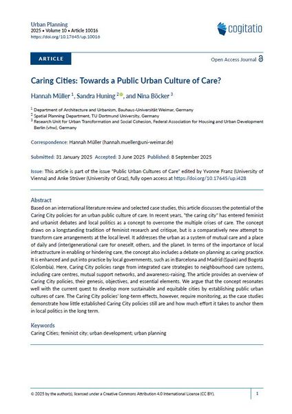 Müller, Hannah, Huning, Sandra & Böcker, Nina (2025): Caring Cities. Towards a Public Urban Culture of Care? In: Urban Planning, 10, Artikel 10016.