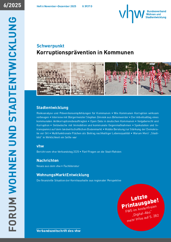 Gerade auf kommunaler Ebene sind Entscheidungen greifbarer als auf Landes- oder Bundesebene: Wer baut hier, an wen werden Dienstleistungsaufträge vergeben, wie wird mit dem An- und Verkauf städtischer Grundstücke verfahren, wie werden Beteiligungen kommunaler Unternehmen gesteuert? In all diesen Bereichen liegt ein großes Risiko, dass Korruption Fuß fasst – und zugleich ein enormes Potenzial zur Prävention. Die Beiträge zum Schwerpunkt dieser Ausgabe von Forum Wohnen und Stadtentwicklung wollen nicht anklagen, sie wollen Anregungen zu einem aktiven Präventionsmanagement geben.