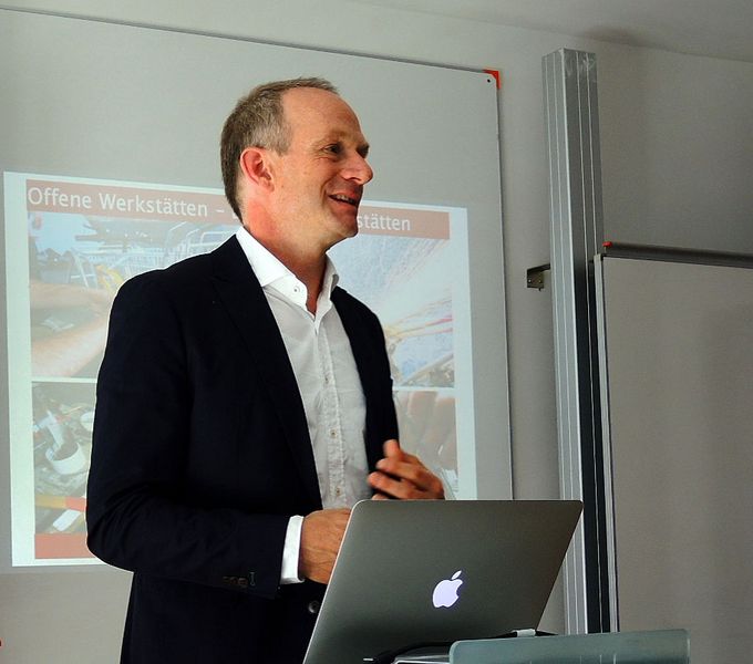 Einen ersten Impuls setzte Dr. Bastian Lange (Foto) von multiplicities. Er gab einen Einblick in die aktuelle Diskussionen um die kreative Stadt und eine Neuausrichtung des Konzepts hin zur "Maker City", der Rückkehr der Produktion in die Stadt, welche veränderte Anforderungen an Prozesse der Koproduktion, Kooperation und Steuerung mit sich bringt sowie neue soziale und kreative Akteure auf den Plan ruft. Im Hinblick auf Governancestrukturen und Möglichkeiten der Förderung von Kreativwirtschaft durch die Kommunen betonte er die Notwendigkeit von spezifischer und verlässlicher Kontextsteuerung, z. B. durch ein Angebot an Räumen und Ressourcen sowie durch Wertschätzung und Verantwortungsübertragung, welche die wichtigen Prozesse der Selbstorganisation gewährleistet und die Eigenlogiken kreativer Akteure berücksichtigt. Die öffentliche Hand kann dabei durchaus zum Motor kritischer Massenbildung werden.